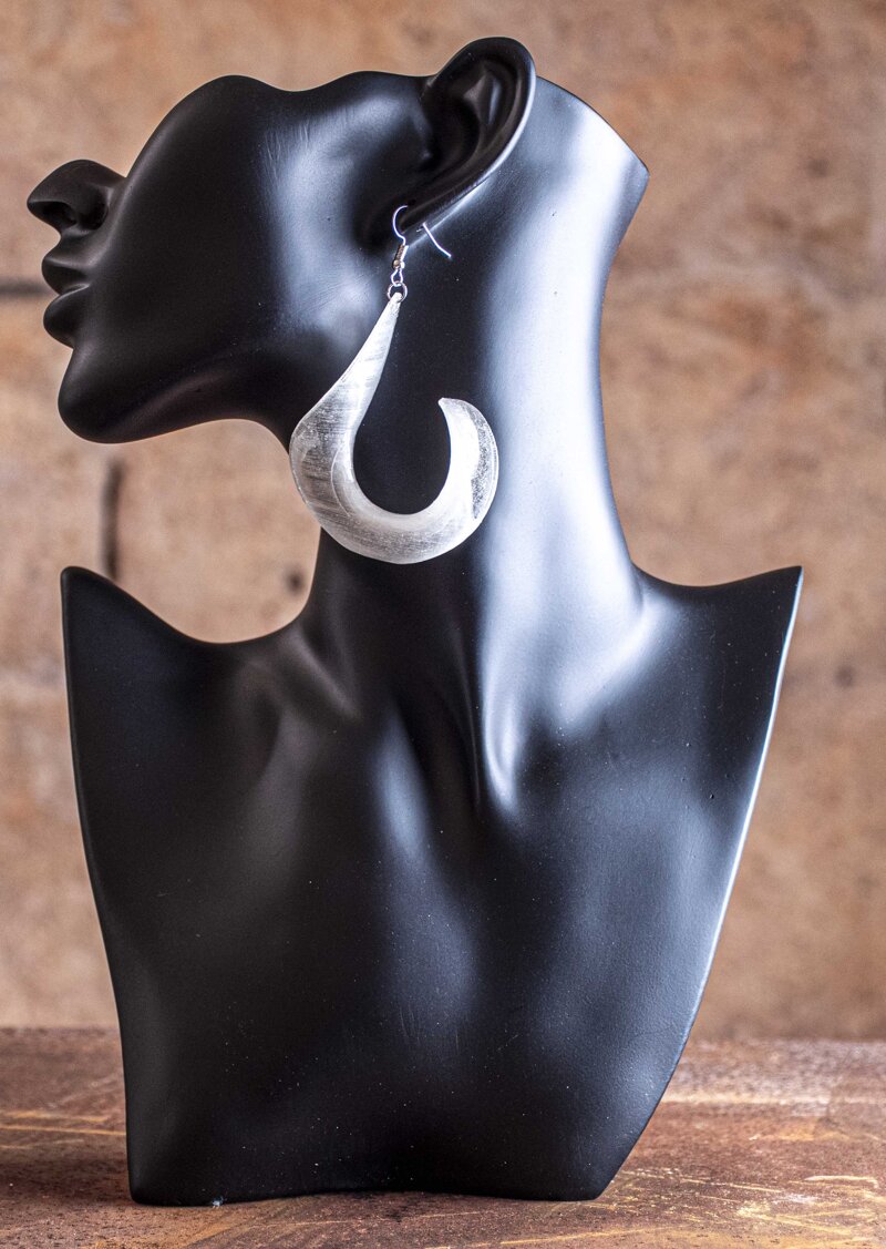 Gli orecchini presentano una forma avvolgente, simile a due corna o crescenti intrecciate. La superficie è liscia e riflettente, catturando la luce in modo seducente.